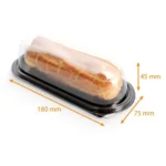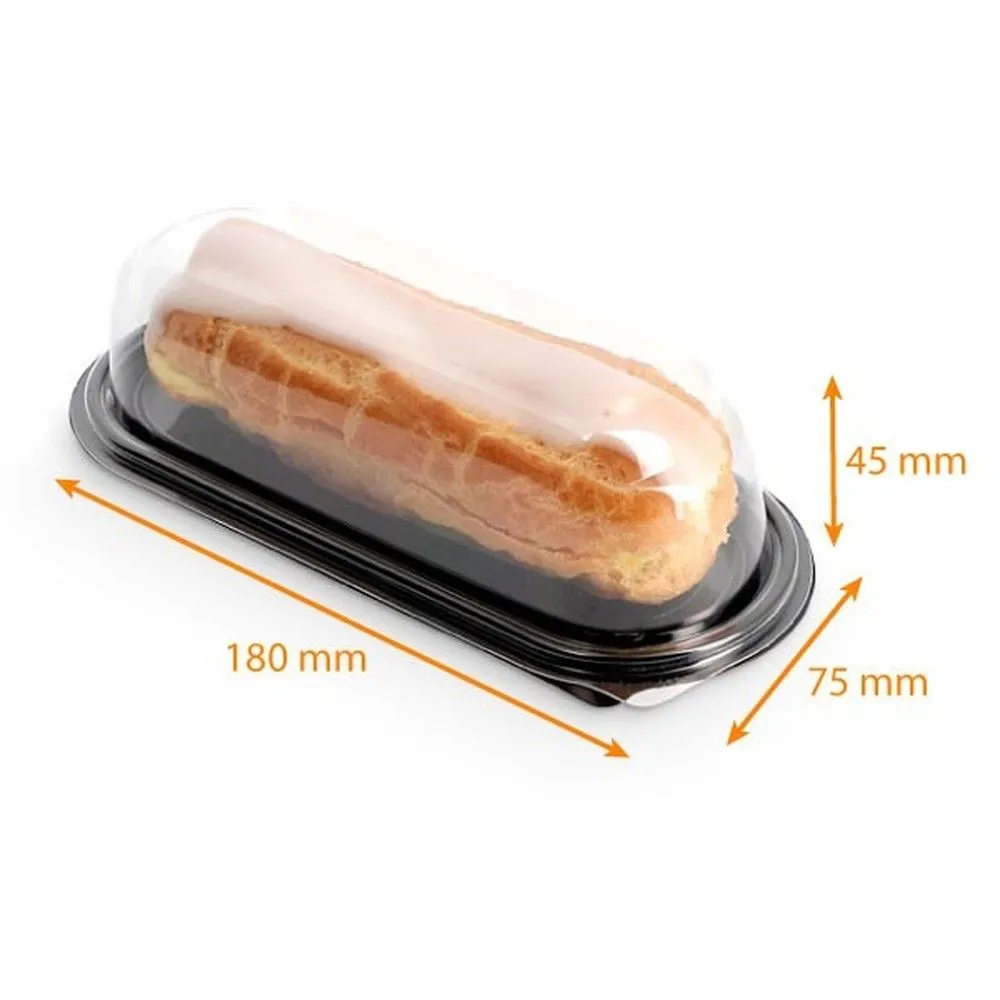 02B0496 Eclair packaging, oval, PS/OPS 180 x 75 mm, height: 45 mm, base: black, lid: transparent, with separate lid. 720 pcs.